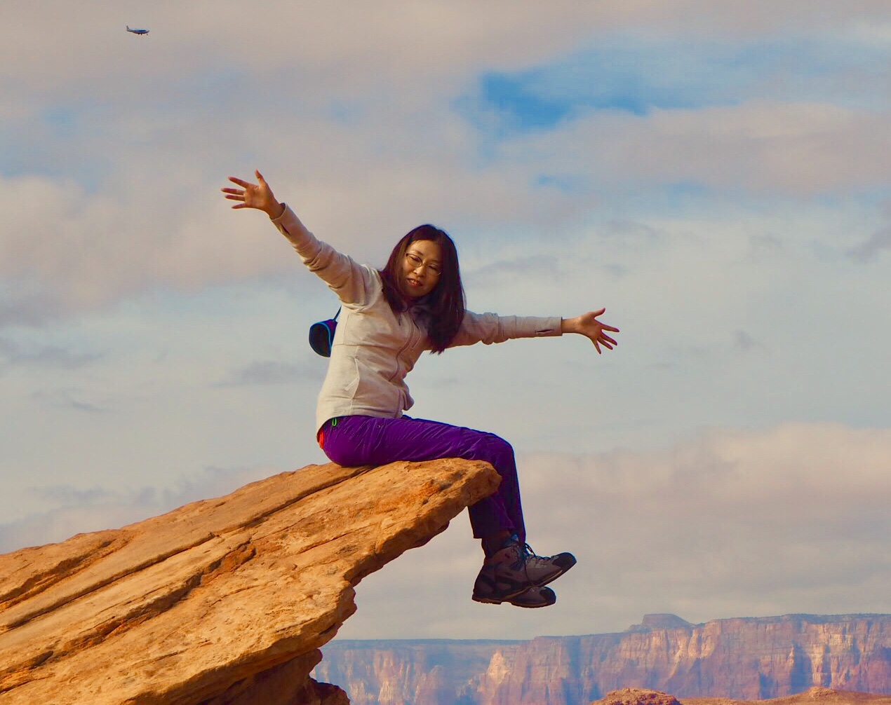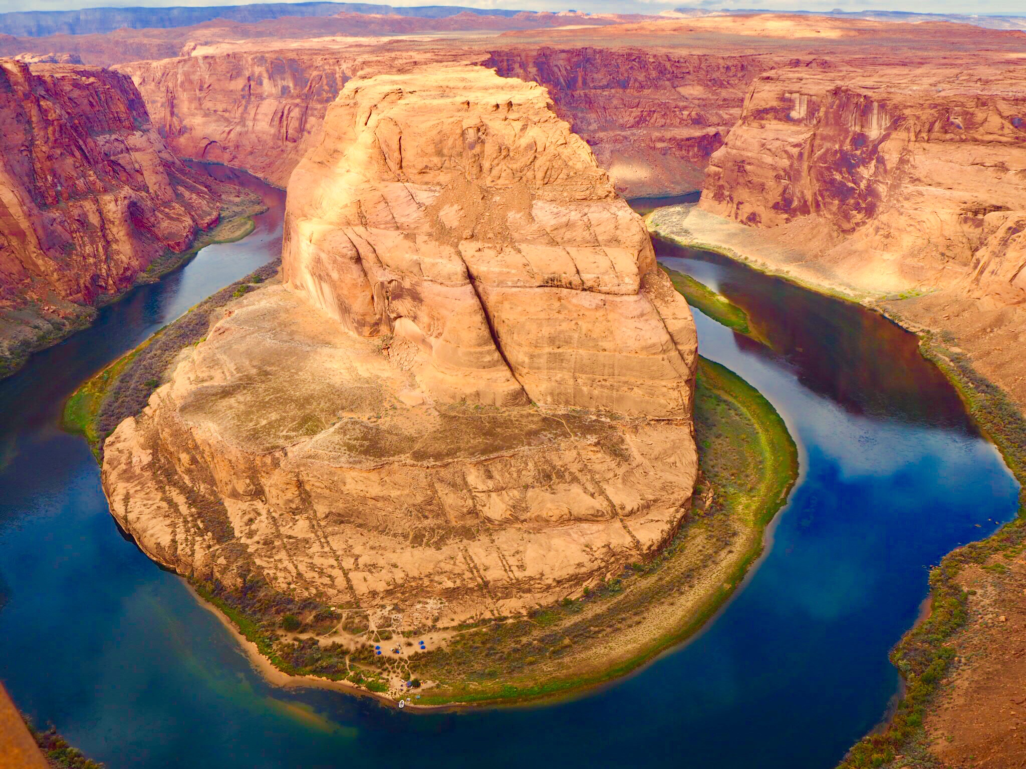 下を流れるコロラド川。グランドキャニオンのほうから続いているのですよね。すごいですよね。川の水がこうして削って、こんな景色を見せてくれているのですから。今回はそんなに晴れてなかったのですが、晴れているとそれは綺麗なエメラルドグリーンの川が見えるそうです。