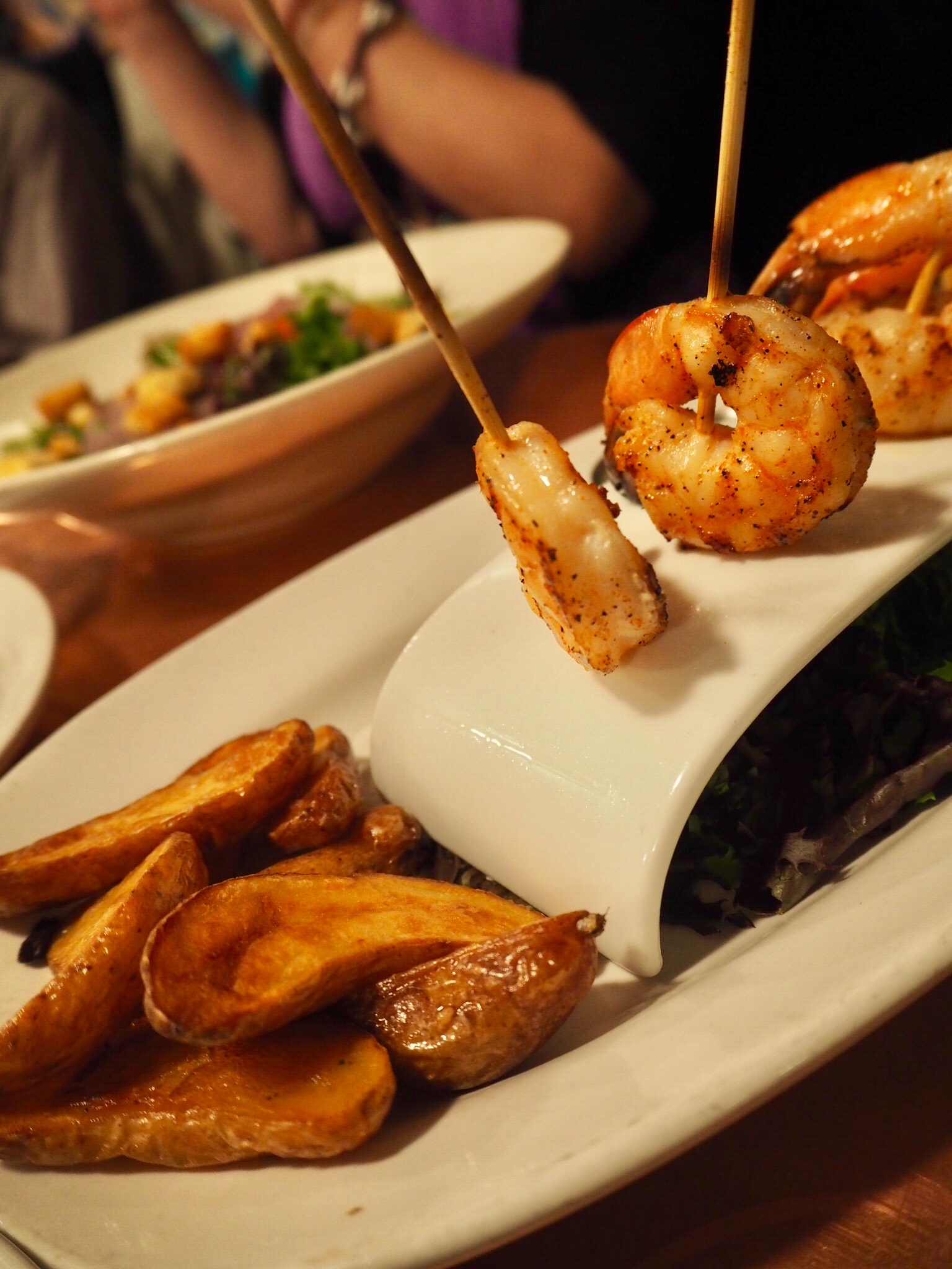 ハンバーガーのお店だったので、パンが食べれないチームとハンバーガーチームにわかれてオーダー。わたくしたちパン食べないチームは昨日の記憶の払拭に海老のリベンジを…。