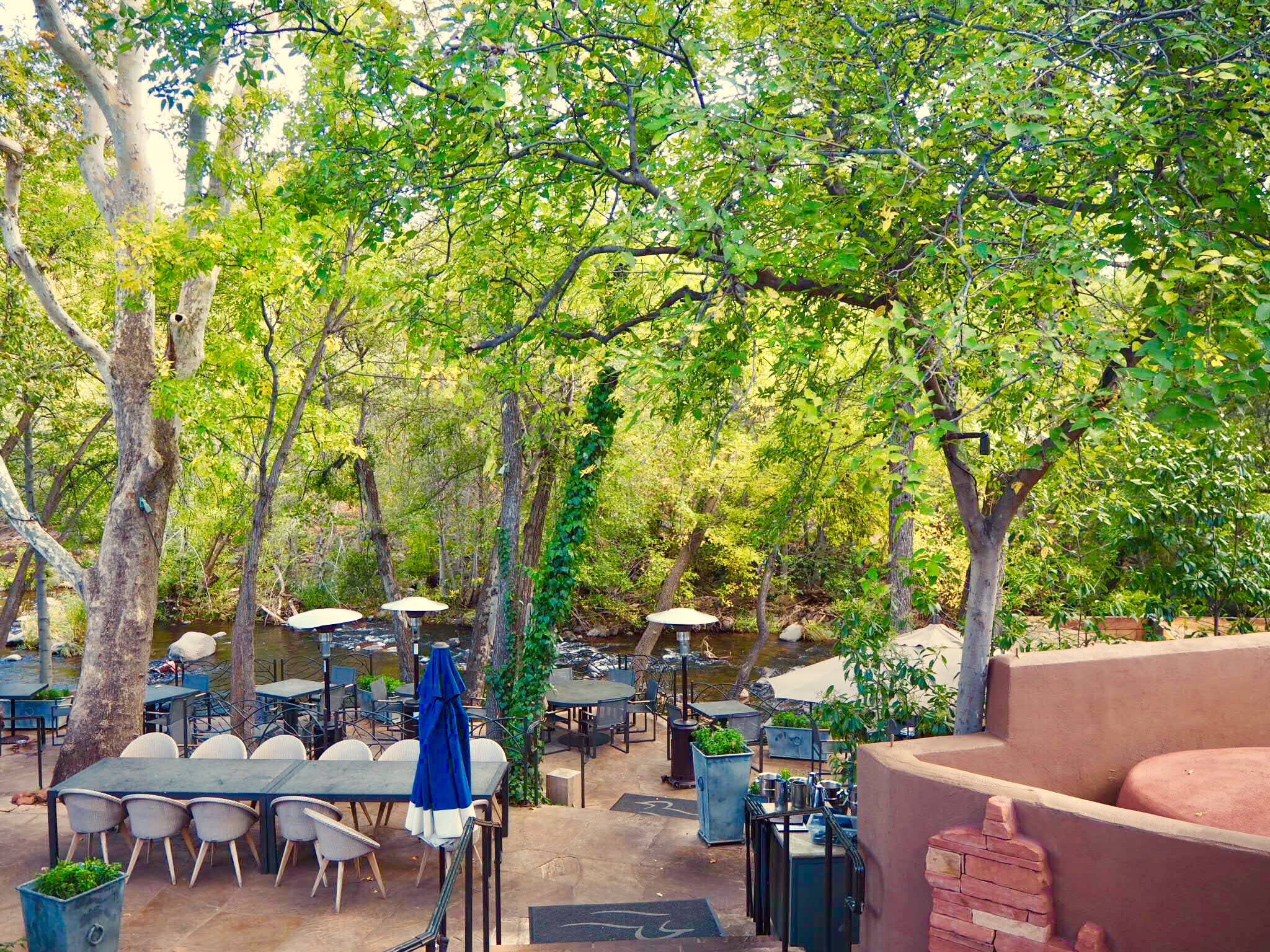 この日は夕方から結婚式があるということでリバーサイドのお席はその準備をしておりました。そんなことでわたくしたちは一段上のテラスで乾杯。