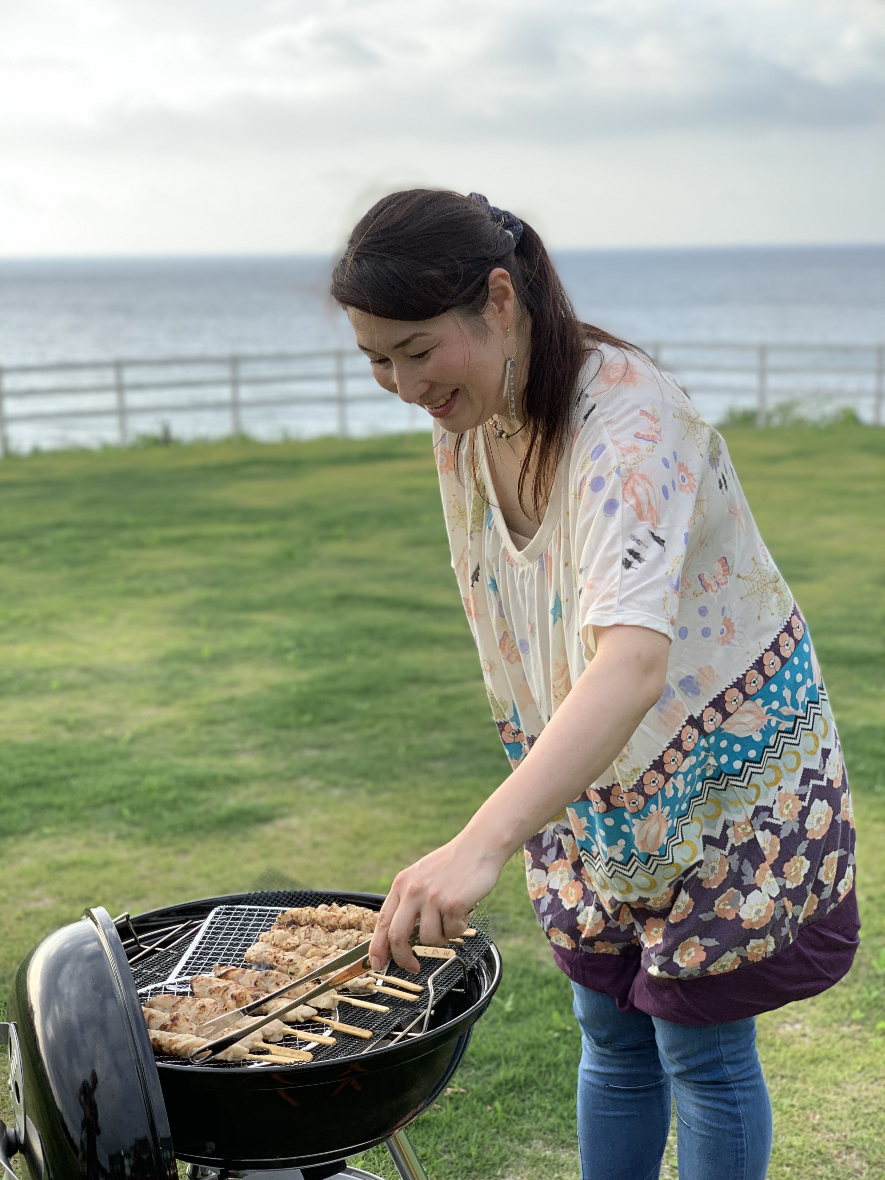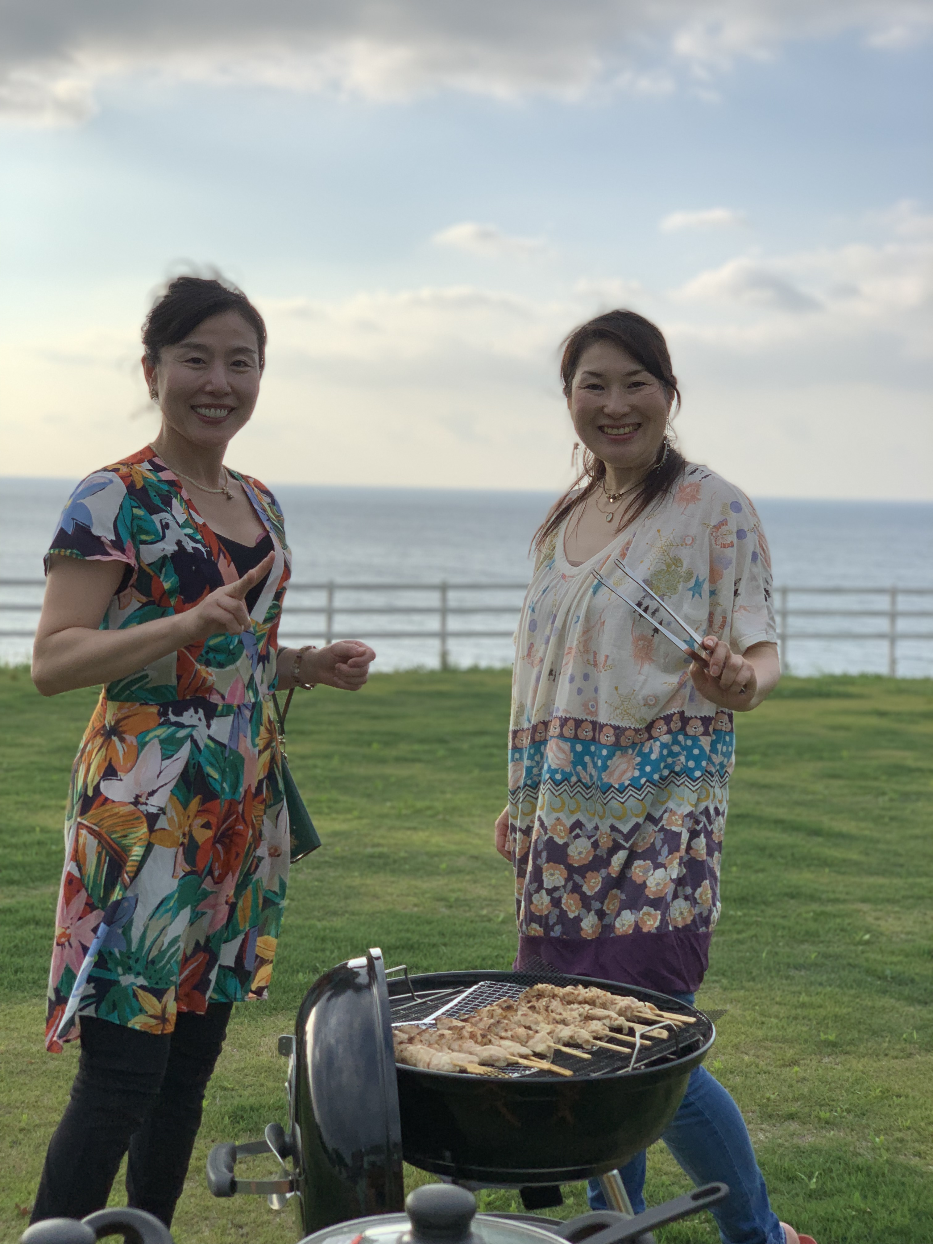 目の前が海の芝生の上で夜はBBQです。食材取り寄せて持ってきてもらったり、コンビニのスーパーバイザーのメンバーが焼き鳥持ってきてくれたりと準備万端。