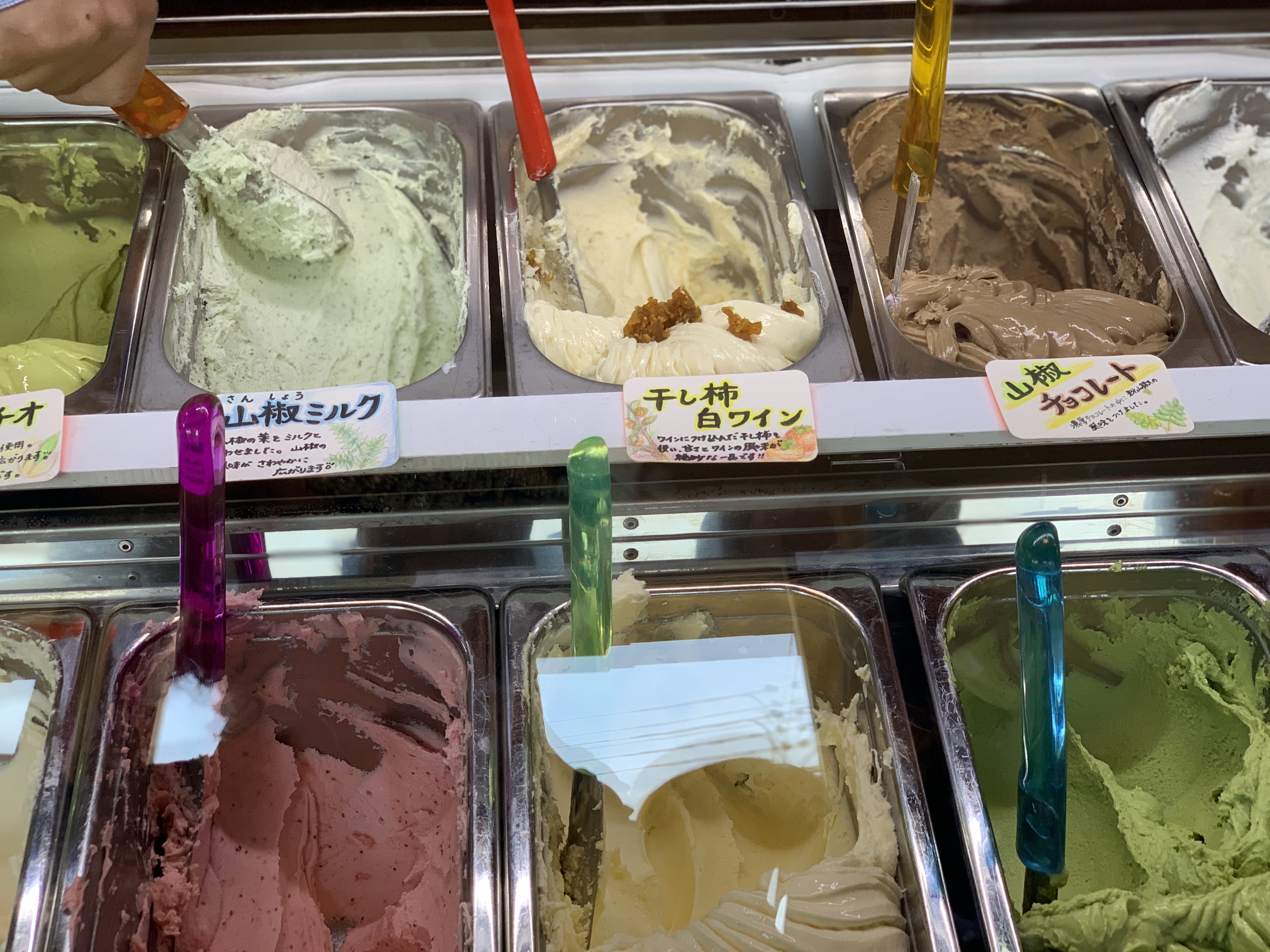 その農園で採れた野菜や山椒を使って作ったジェラートは山椒ミルク、山椒チョコレート、干し柿とワイン、縮みキャベツとヘーゼルナッツ、ピスタチオなどなど個性的でどれも試してみたくなります。