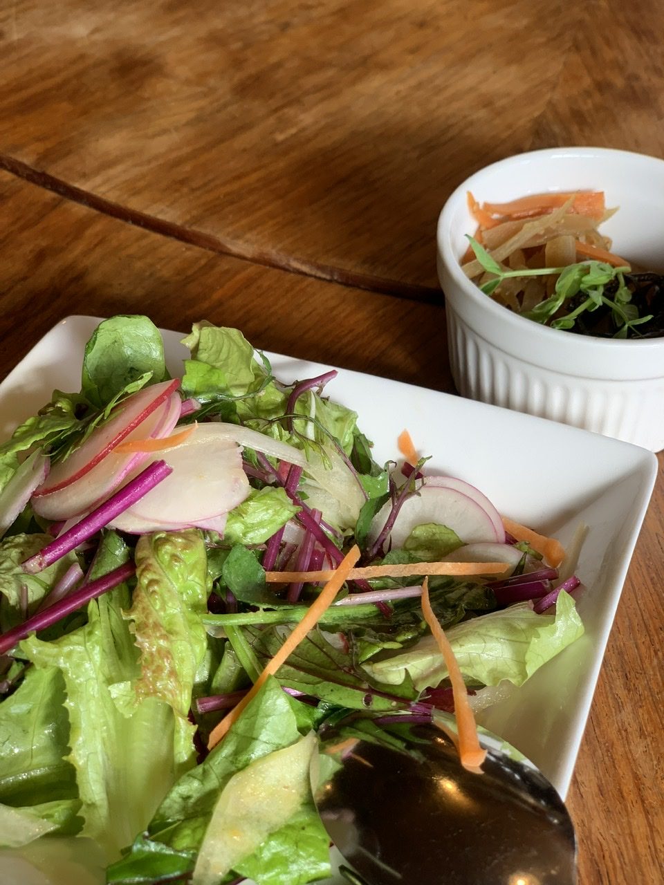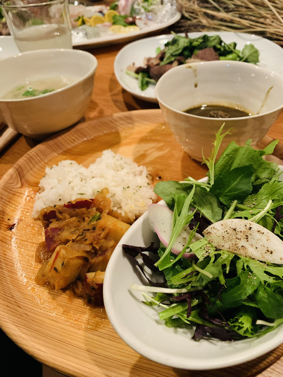 ビオアグリさんで採れたカブを使ったサラダとスープが優しいお味。奥はヤーコンのきんぴらです。淡路で頂いたお野菜のどれもがピカピカで味が濃くて、美味しいのです。
