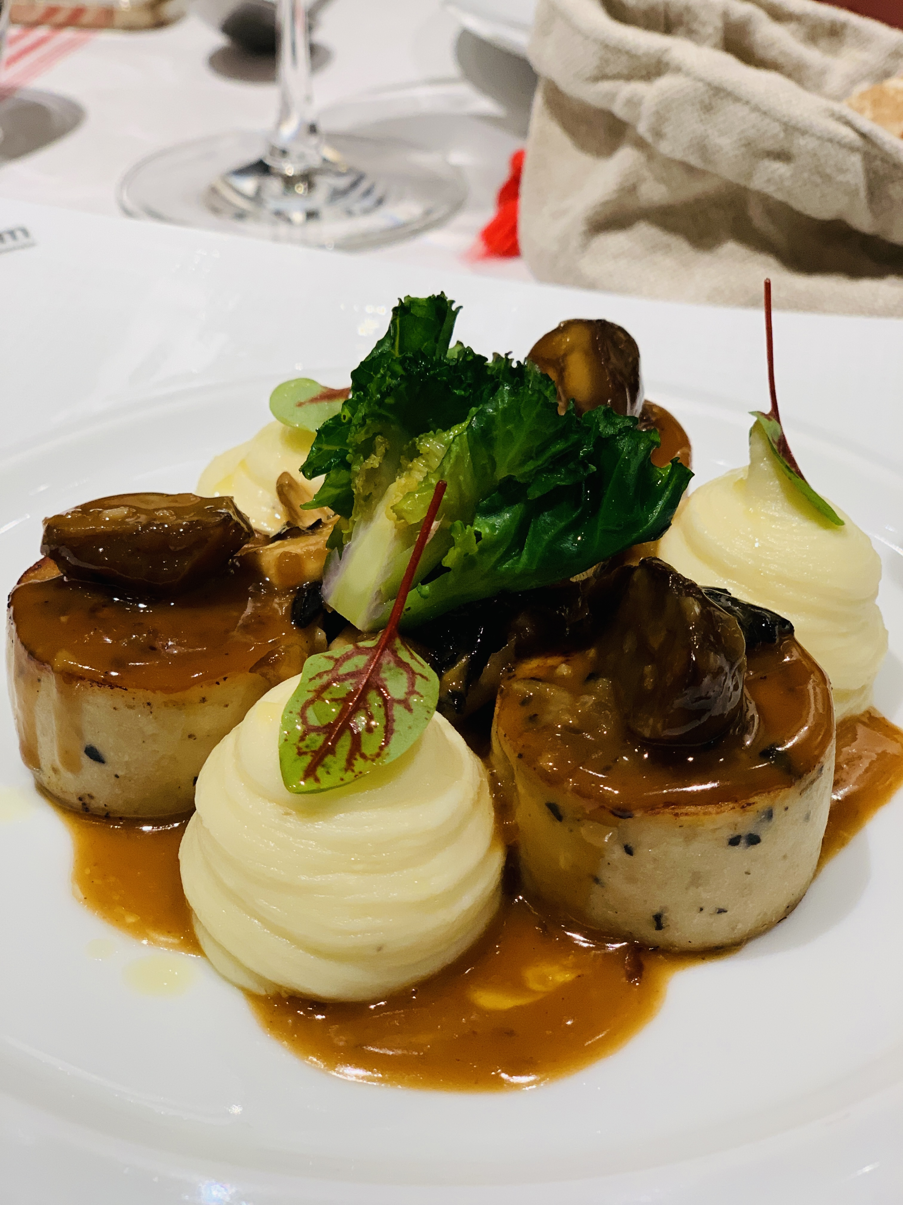 (メインの豚のソーセージに栗とキノコのソースとマッシュホテとが最高)