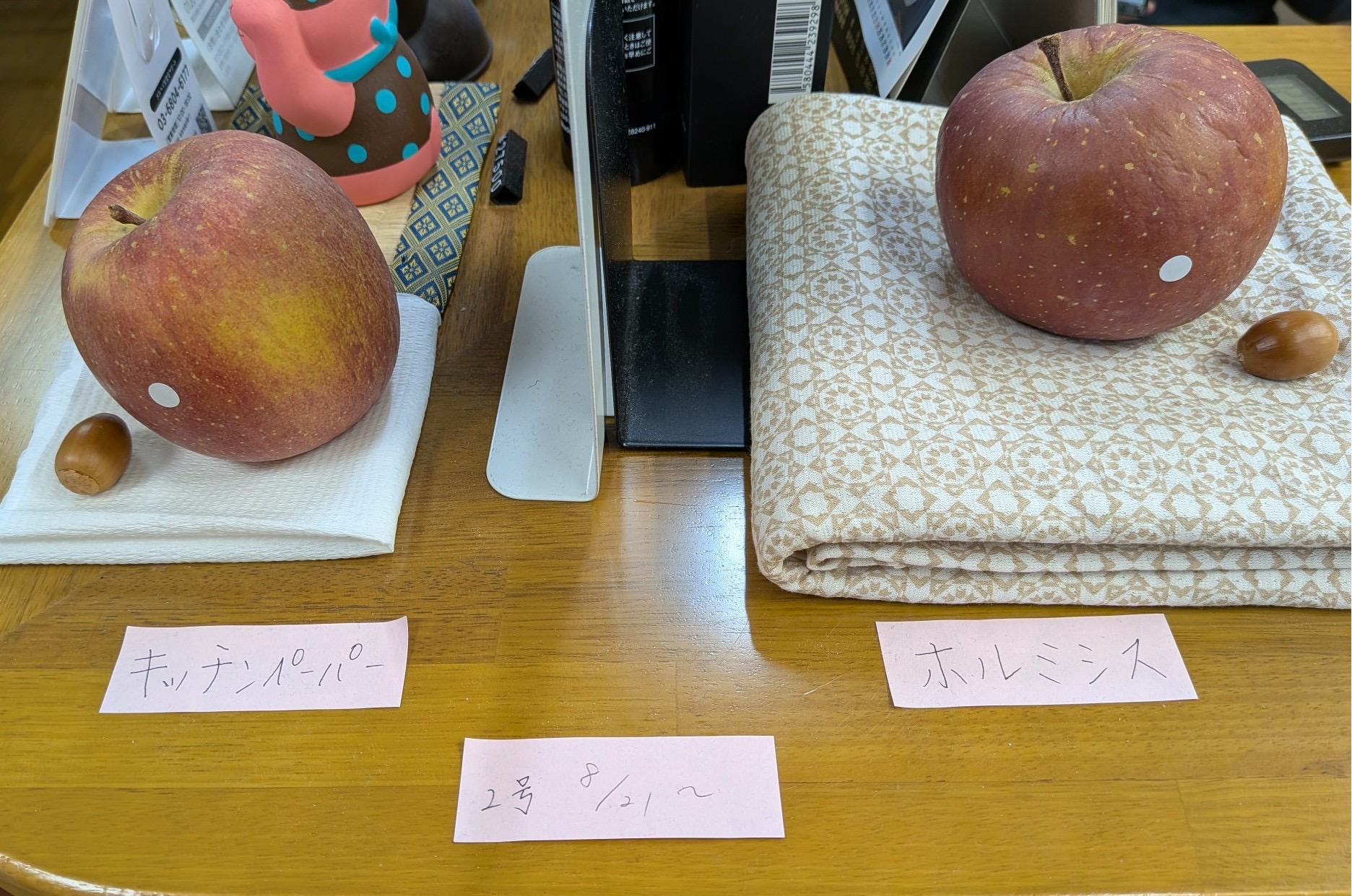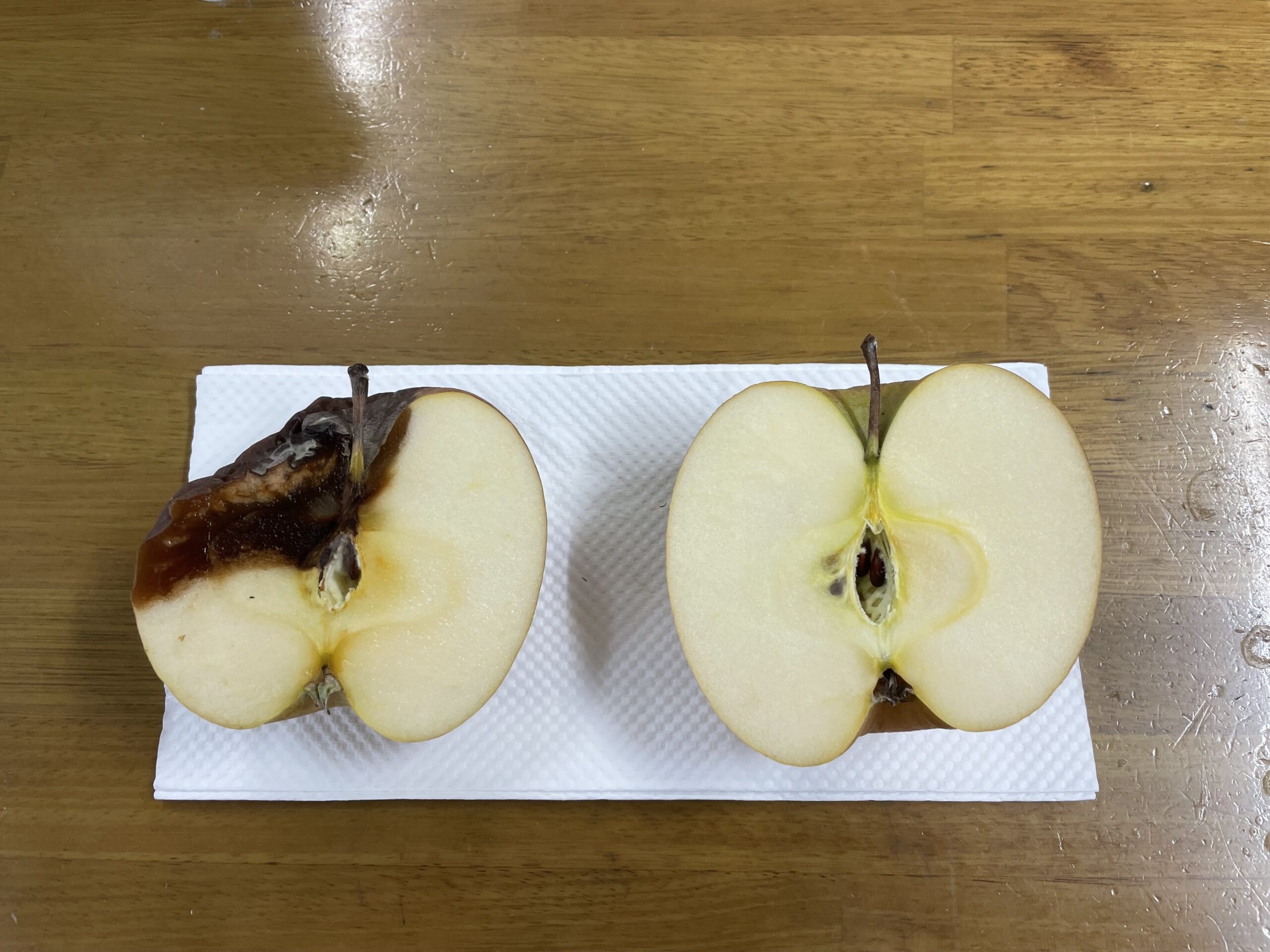 リンゴとホルミシスブランケットの上に置いたリンゴで腐敗実験をしています。
