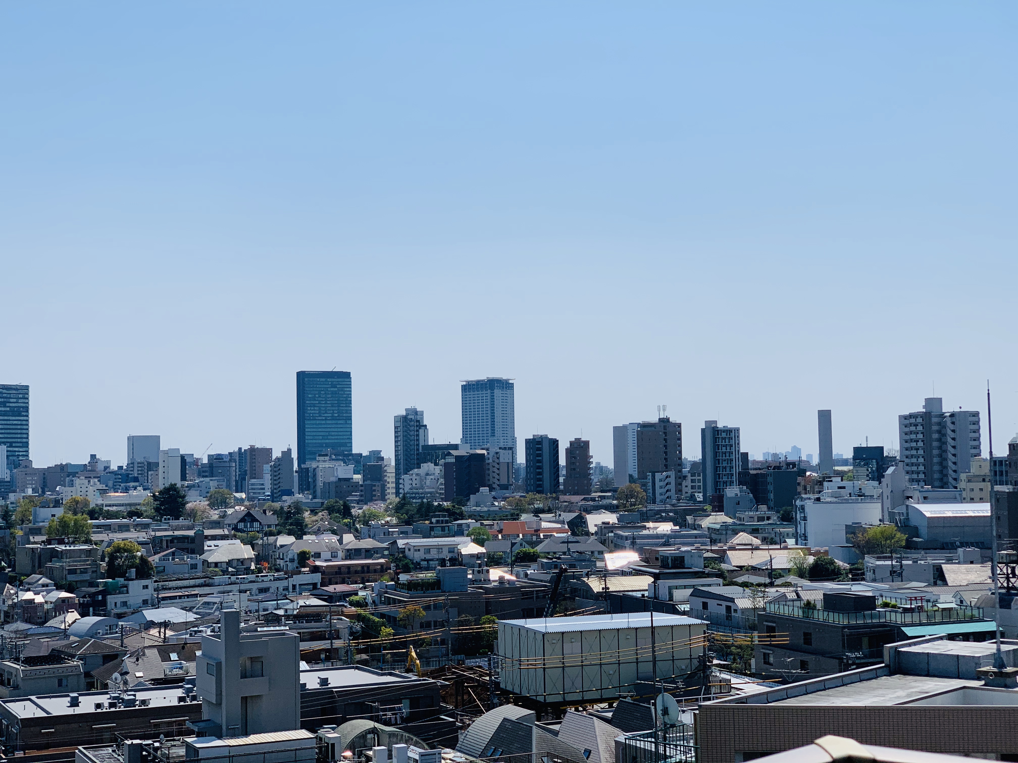 ベランダからみた風景。写真右端は安部さんちの方面。左端が麻生さんちの方面。ゴルゴ13なら狙えるかも。